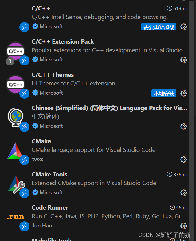 当然,还要下载C/C++、Code Runner和CMake等插件,见下图,大家自行安装
