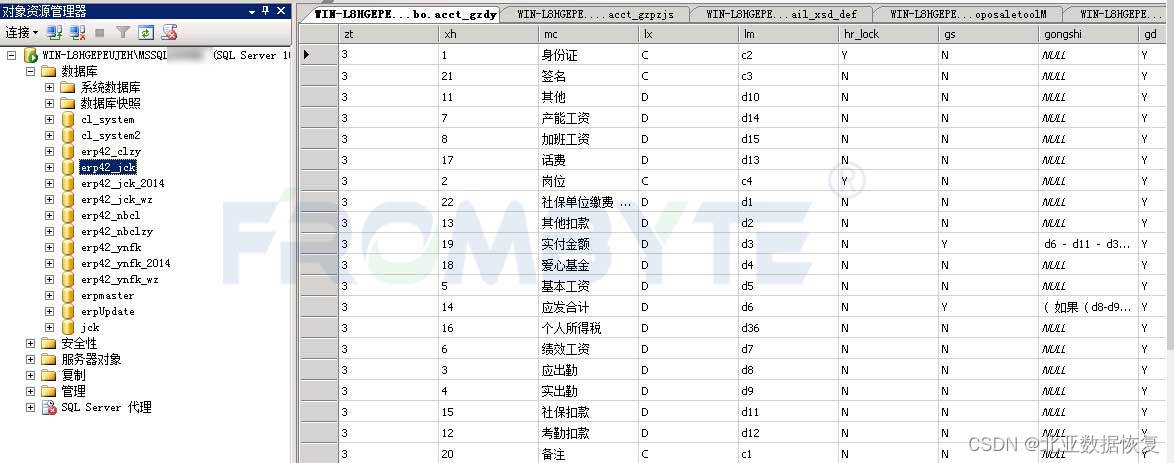 根据SQLServer数据库的结构去自由空间中找到数据库的开始位置。SQLServer数据库的第9个页会记录本数据库的数据库名,根据这个特征核对此数据库的头部页是否是正在查找的。SQLServer数据库的每个页中都会记录数据库页编号以及文件号,北亚企安数据恢复工程师根据这个特征编写数据库扫描程序,去底层扫描所有符合数据库页的数据碎片。按顺序将扫描出来的碎片重组成一个完整MDF文件,通过MDF校验程序检测整个MDF文件的完整性。在整个校验过程中,只有cl_system3.dbf和erp42_jck.dbf这2个文件由于有部分碎片没有找到所以校验不通过之外,其余数据库文件均校验成功。