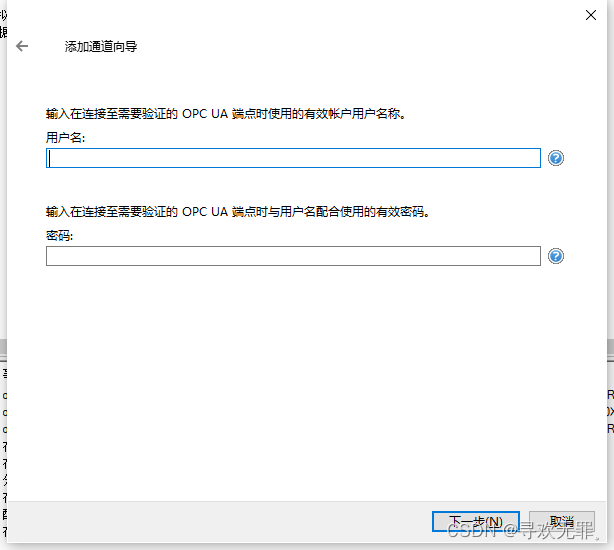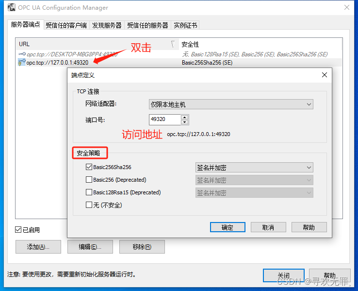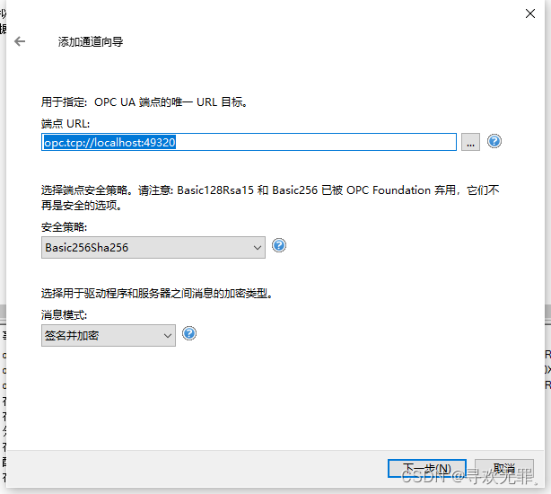 创建OPCUA Client这个通道作为的是一个客户端,因此需要写入连接的服务器的url,我们连接到就是另一个通道,所以使用,opc.tcp://localhost:49320。安全策略也需要跟服务器的保持一致。