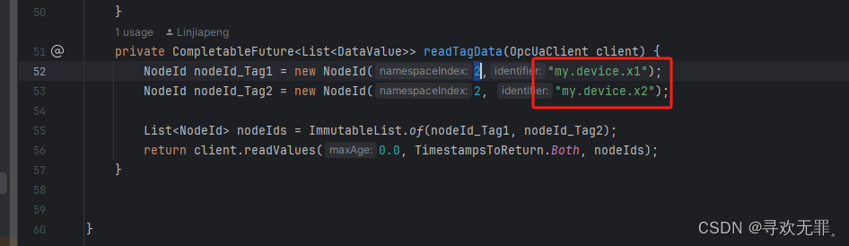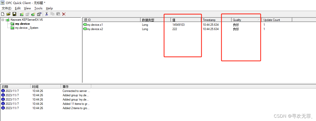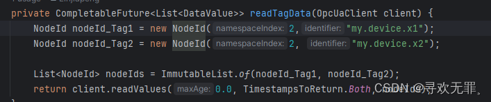 private void subscribe(OpcUaClient client) throws Exception { AtomicInteger atomic = new AtomicInteger(1); //创建发布间隔1000ms的订阅对象 client .getSubscriptionManager() .createSubscription(1000.0) .thenAccept(t -> { //节点1 NodeId nodeId1 = new NodeId(2,"my.device.x1"); ReadValueId readValueId1 = new ReadValueId(nodeId1, AttributeId.Value.uid(), null, null); //节点2 NodeId nodeId2 = new NodeId(2,"my.device.x2"); ReadValueId readValueId2 = new ReadValueId(nodeId2, AttributeId.Value.uid(), null, null); //创建监控的参数 MonitoringParameters parameters = new MonitoringParameters(UInteger.valueOf(atomic.getAndIncrement()), 1000.0, null, UInteger.valueOf(10), true); //创建监控项请求 //该请求最后用于创建订阅。 MonitoredItemCreateRequest request1 = new MonitoredItemCreateRequest(readValueId1, MonitoringMode.Reporting, parameters); MonitoredItemCreateRequest request2 = new MonitoredItemCreateRequest(readValueId2, MonitoringMode.Reporting, parameters); List requests = new ArrayList<>(); requests.add(request1); requests.add(request2); //创建监控项,并且注册变量值改变时候的回调函数。 t.createMonitoredItems( TimestampsToReturn.Both, requests, (item, id) -> item.setValueConsumer((it, val) -> { System.out.println("标识为" + it.getReadValueId().getNodeId()+"的项的值被更新为:"+ val.getValue().getValue()); }) ); }).get(); //持续订阅 Thread.sleep(Long.MAX_VALUE); } 订阅功能参考文献:SpringBoot集成Milo库实现OPC UA客户端:连接、遍历节点、读取、写入、订阅与批量订阅-CSDN博客