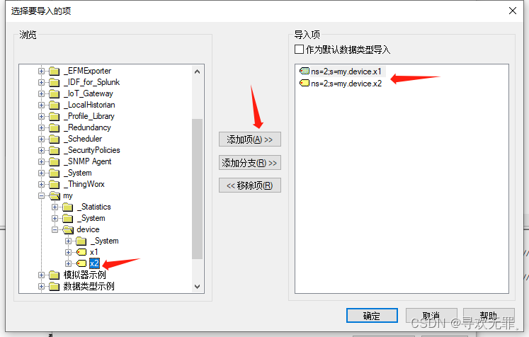 点击导入,就会自动使用刚刚新建通道的时候填入的rul、安全策略、用户名认证进行连接,之后读取里面的值,你可以具体选择一些项进行导入。之后我们就可以在新建的设备上看到他们。注意看,默认的ns确实是2,具体的indentifers名组成为:通道名.设备名.标签名。