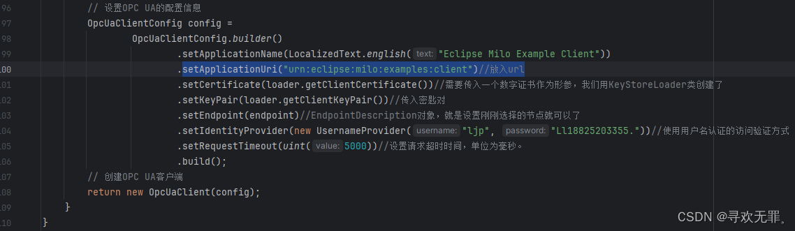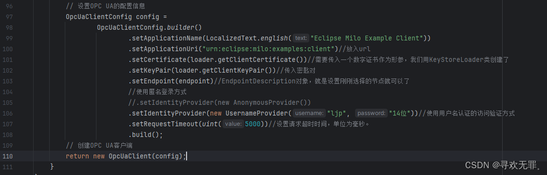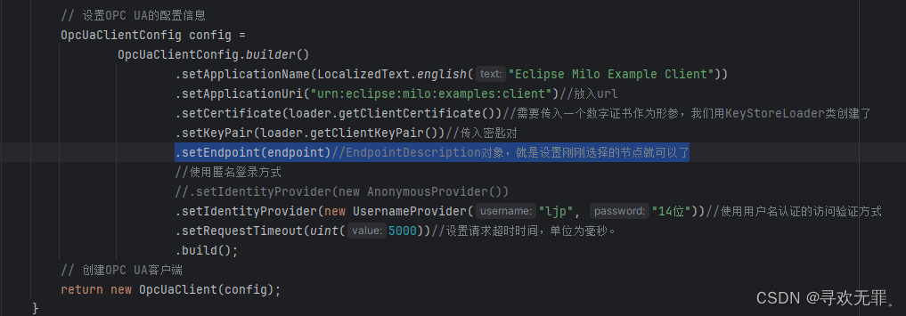 在OpcUAClientRunner类中创建客户端的时候,需要传入客户端的配置,就需要设置具体的端口,