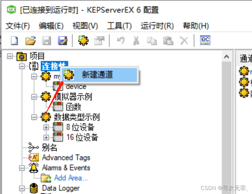 在创立出来的通道(你设置的名字)上,右击选择新建设备。