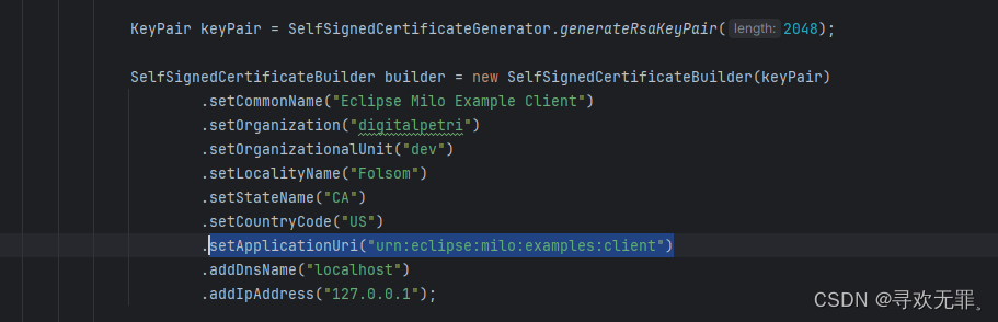 该类用于生成一个客户端访问的证书,提交给服务器,该类内容无需更改。我们只需要运行一遍代码之后生成证书,之后在KEPServerEX6中的OPCUA配置中信任客户端,即信任该证书即可。
