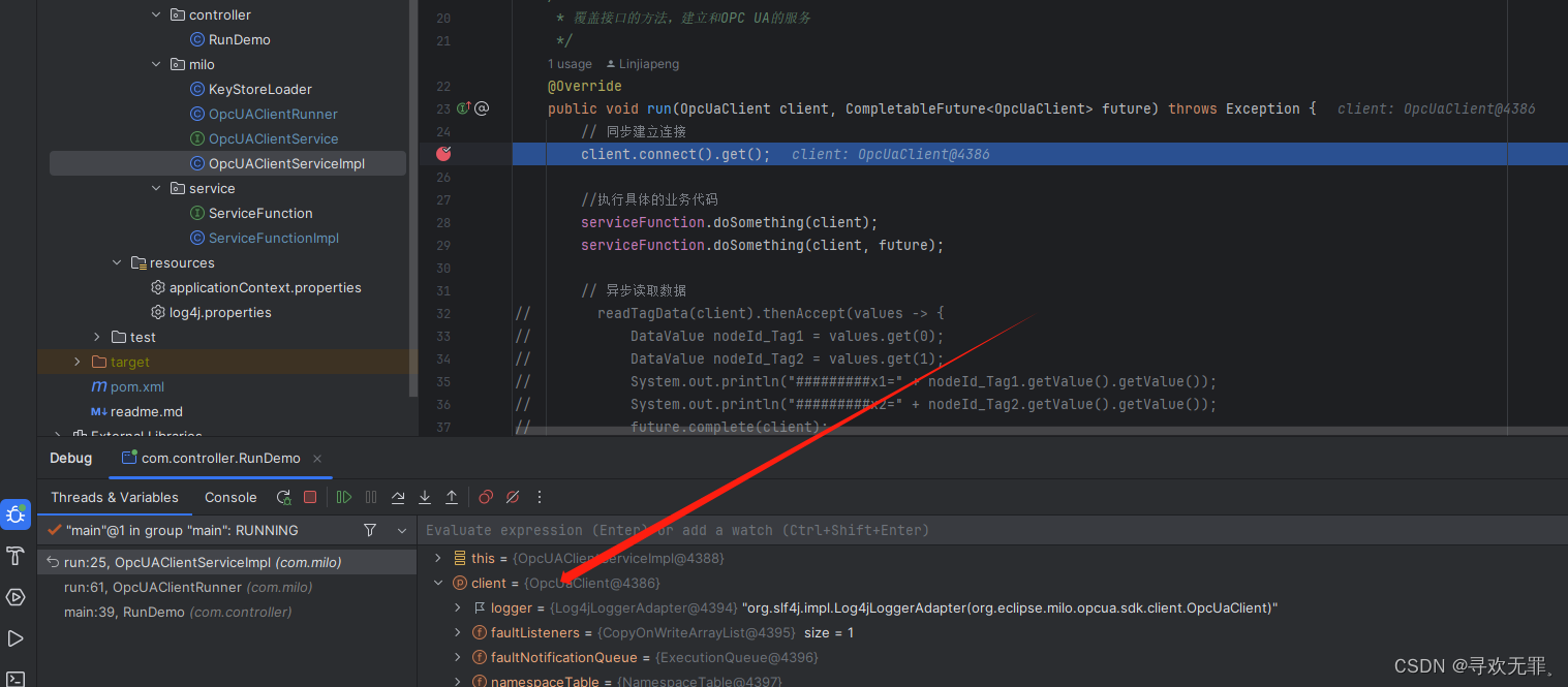 入口函数内,会创建一个OpcUAClientRunner对象,并将IOC容器中的opcUAClientService传进去,并调用前者的run方法。