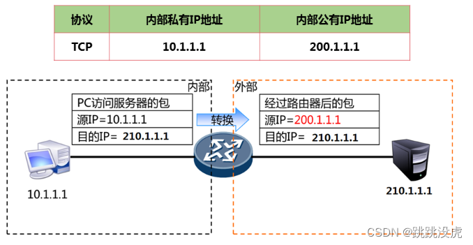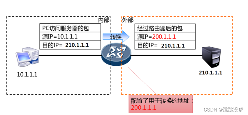 路由器对数据包进行地址转换,路由器在接收到内部数据包时将内部源IP地址转化为公有IP地址后在进行路由转发。