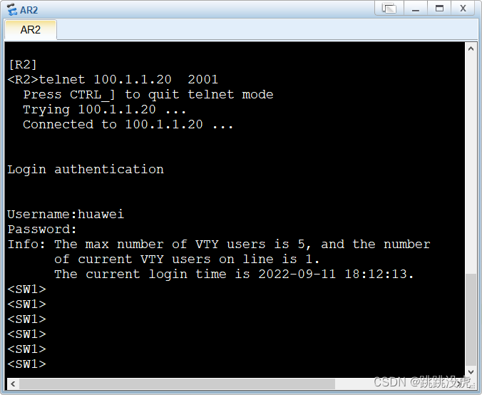 [AR1]interface gi0/0/1 [AR1-GigabitEthernet0/0/1]nat server protocol tcp global 100.1.1.20 2001 inside 192.168.10.88 23 [AR1-GigabitEthernet0/0/1]quit 测试:在R2上测试登录
