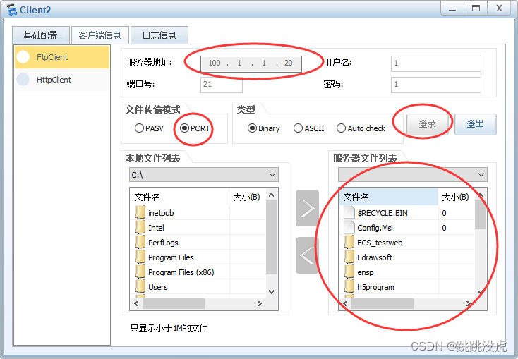 [AR1]interface gi0/0/1 [AR1-GigabitEthernet0/0/1]nat server protocol tcp global 100.1.1.20 21 inside 19 2.168.10.10 21 [AR1-GigabitEthernet0/0/1]quit 外网设备测试 client -> ftpclient -> 100.1.1.20 (PORT模式),登陆成功