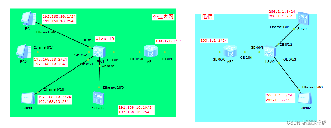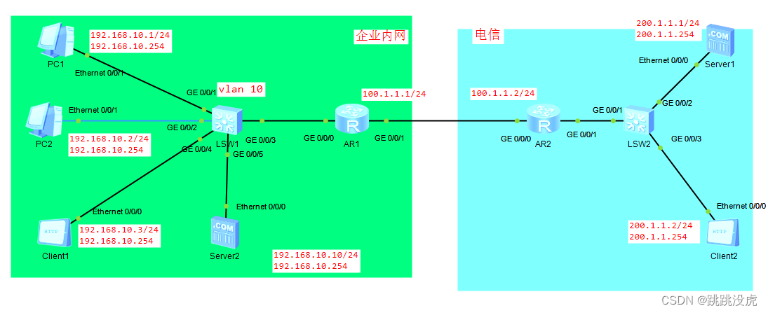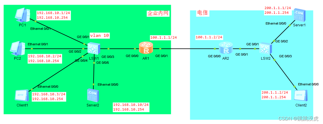 [AR1]interface gi0/0/1 [AR1-GigabitEthernet0/0/1]nat server protocol tcp global 100.1.1.20 80 inside 19 2.168.10.10 80 [AR1-GigabitEthernet0/0/1]quit 验证