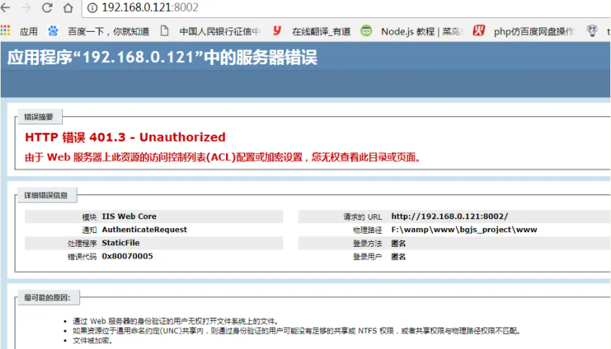 问题描述:HTTP 错误 401.3 - 未经授权:访问由于 ACL 对所请求资源的设置被拒绝。