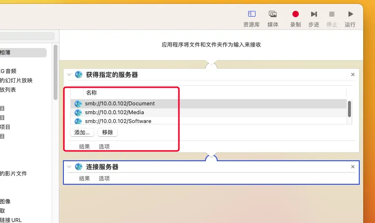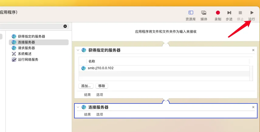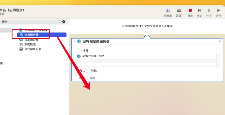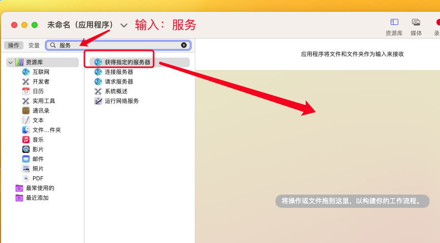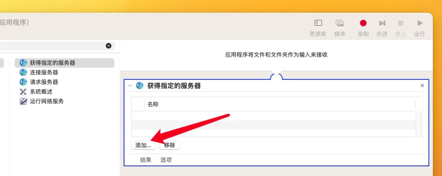 在输框中输入“服务”可以得到上图结果,鼠标点击“获得指定的服务器”不松手,拖动到箭头指定区域,即可出现下图图示。点击添加。