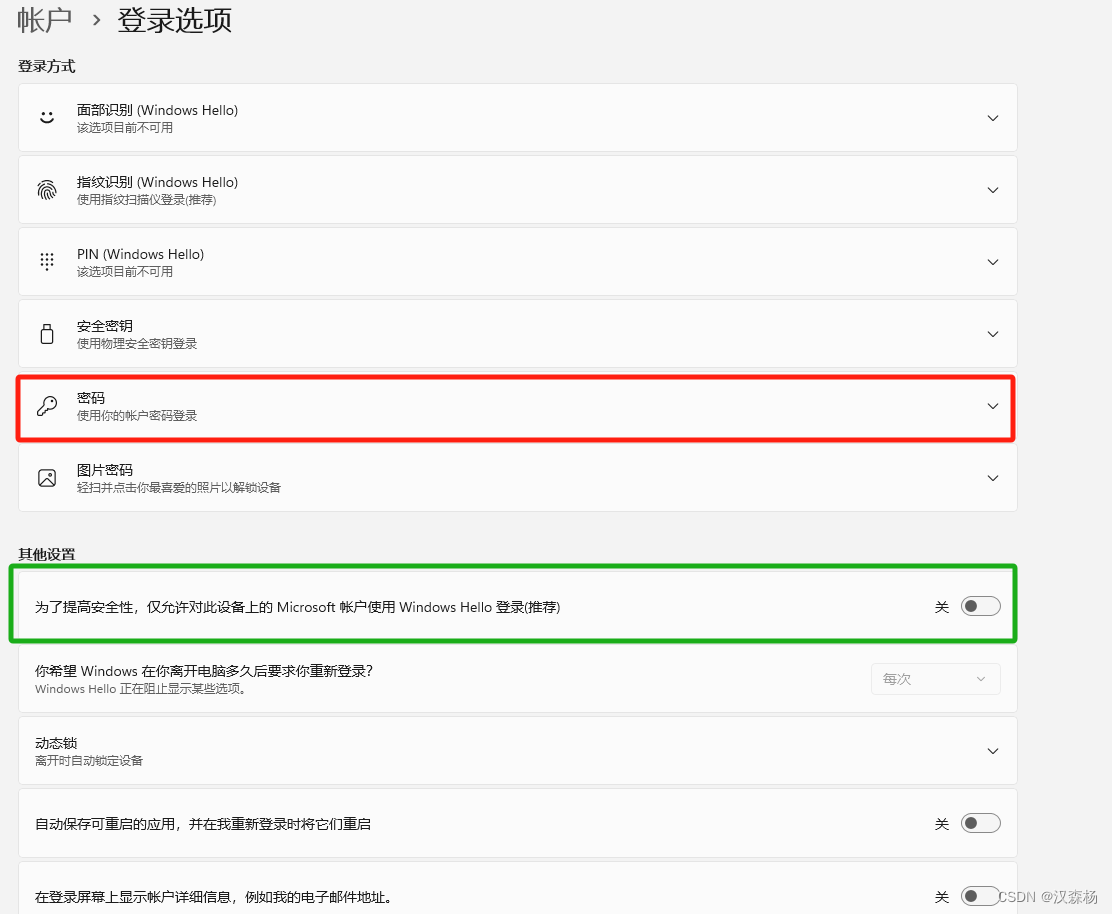 1、如果在被控端电脑设置里面没有将Windows Hello登录选项关闭,直接在获得用户名后输入用户名和微软账户密码是不行的,我试过很多次,我粗浅地认为用户凭据里的这个密码不是PIN,所以如果不关闭上述登录选项的话,进入电脑的方式就是PIN或者指纹其他的,就没有密码选项了,这样不满足远程桌面连接条件;