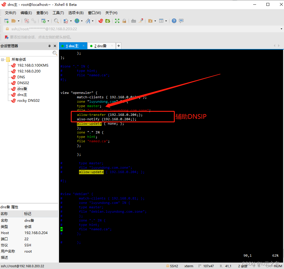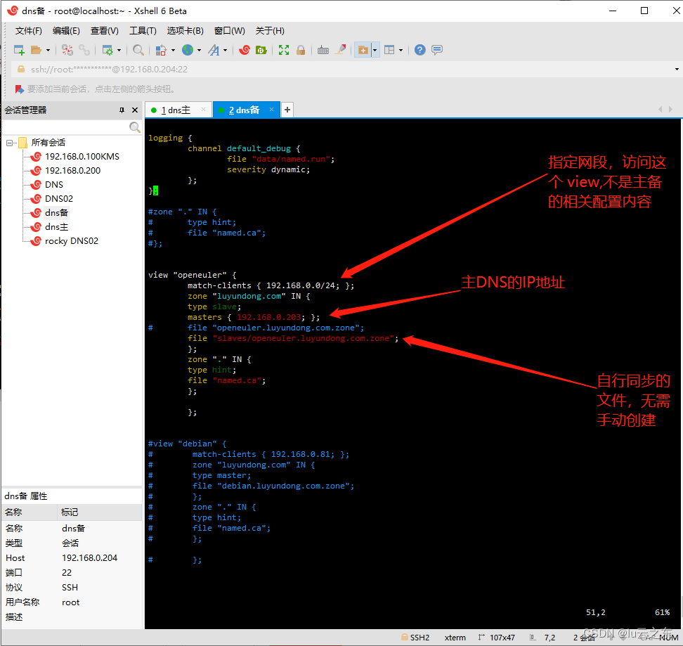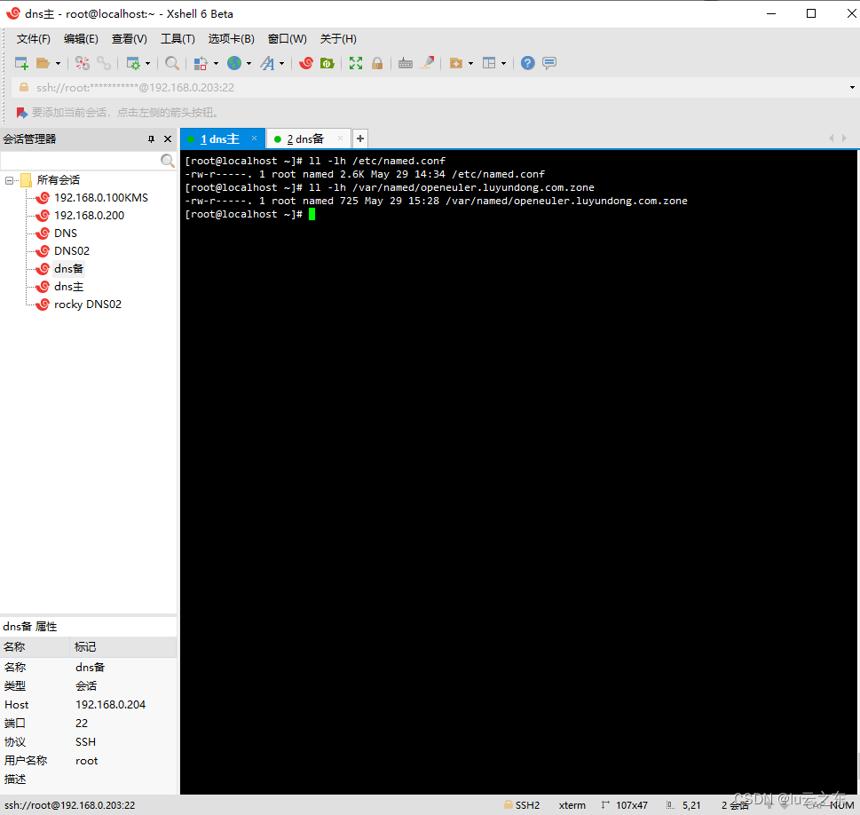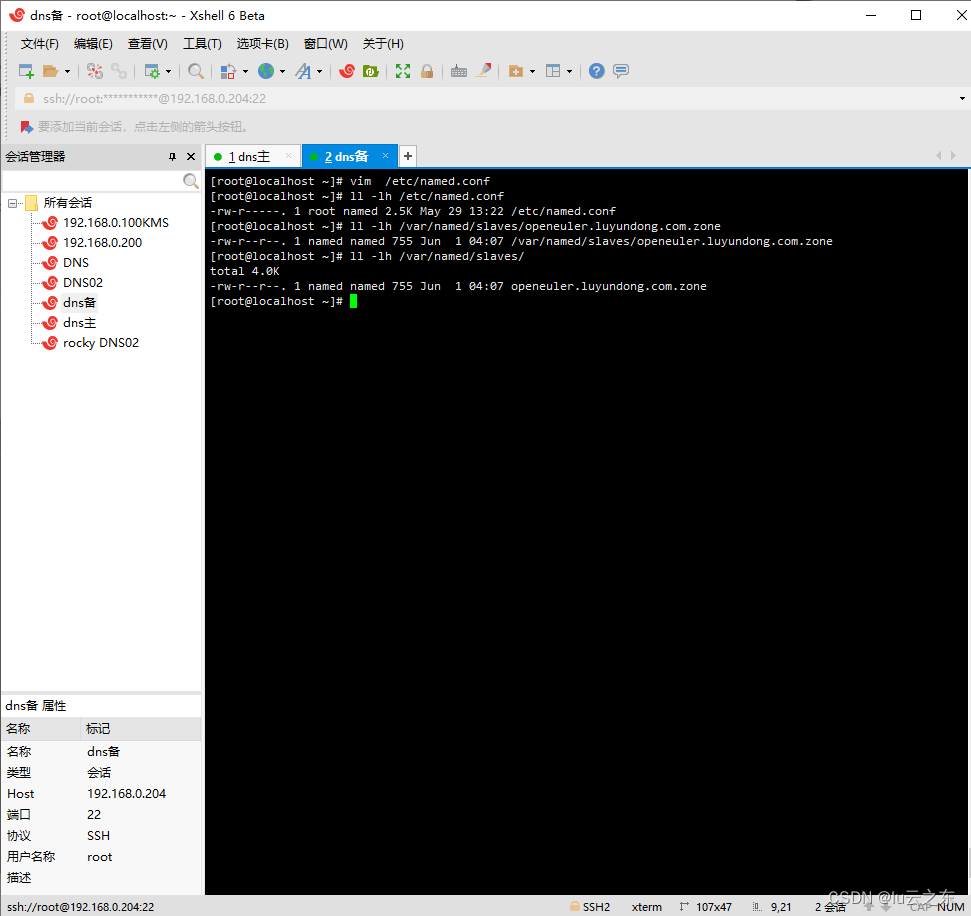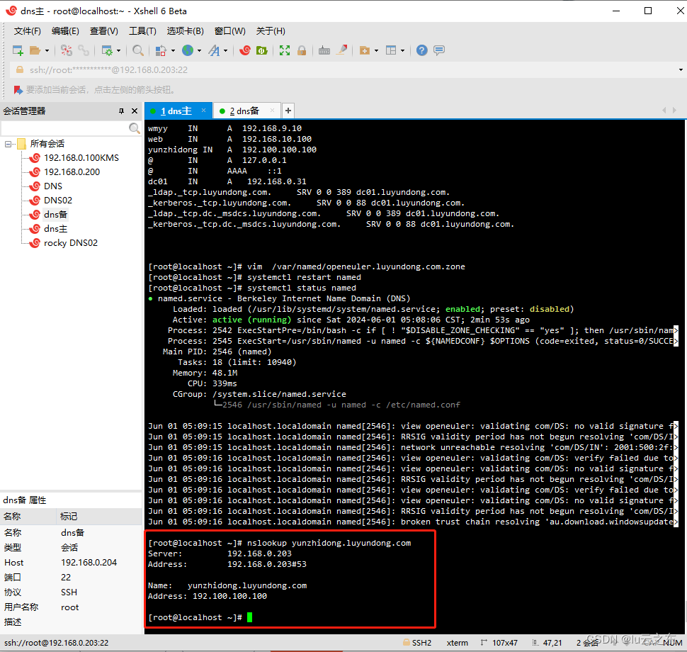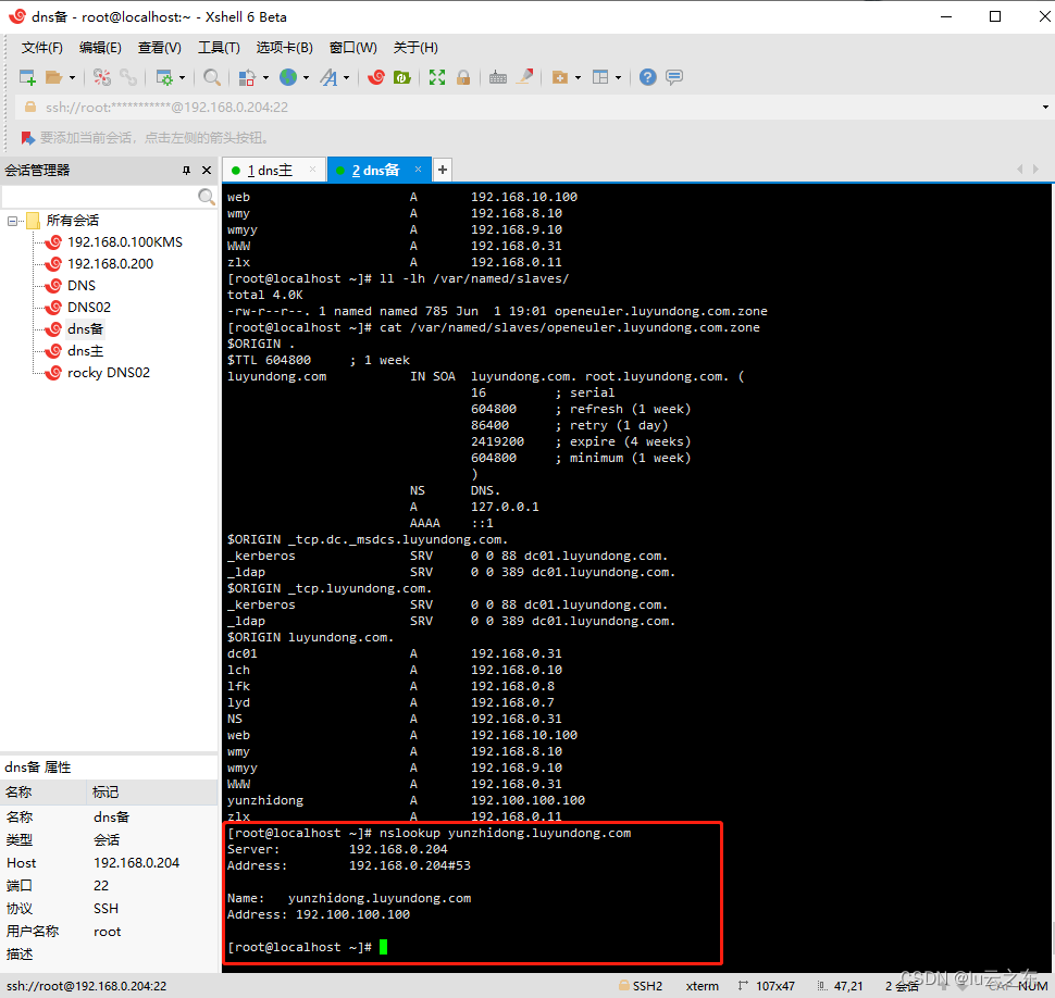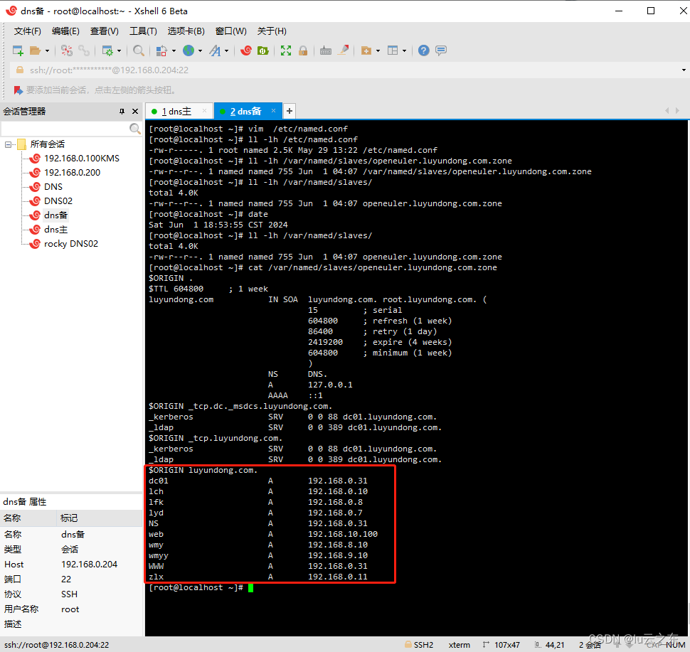 需要注意的是/var/named/slaves/openeuler.luyundong.com是自行同步的文件,无需手动创建,同步的内容同主DNS上的/var/named/openeuler.luyundong.com是一样的。