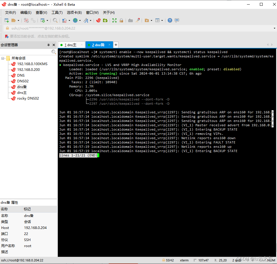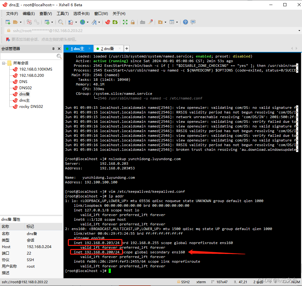 修改配置文件,两边都重启keepalived服务,我们可以发现,主的DNS中的keepalived优先级比较高,可以看图,VIP在192.168.0.203机器上有192.168.0.200的IP