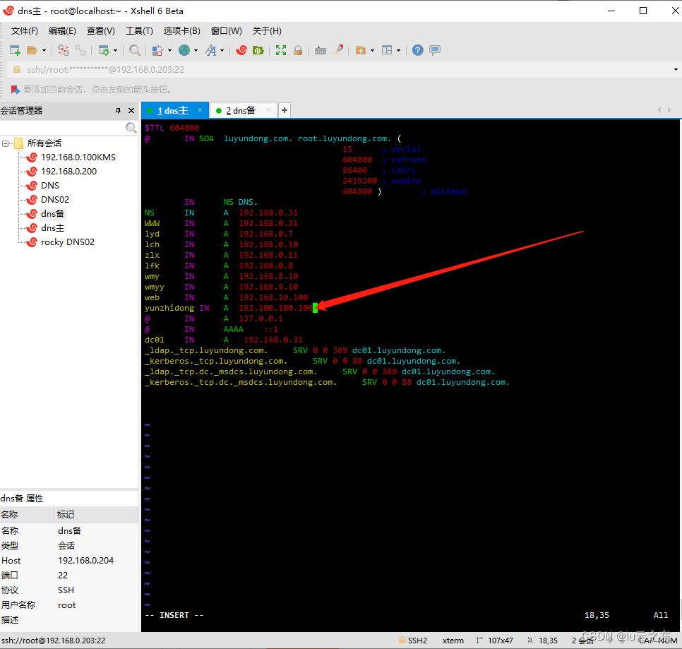 接下来,我们修改主DNS的解析文件,增加一条记录