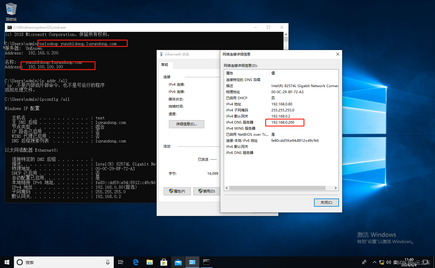 我们把windows 10测试电脑,DNS改成192.168.0.200,看能不能正常解析。