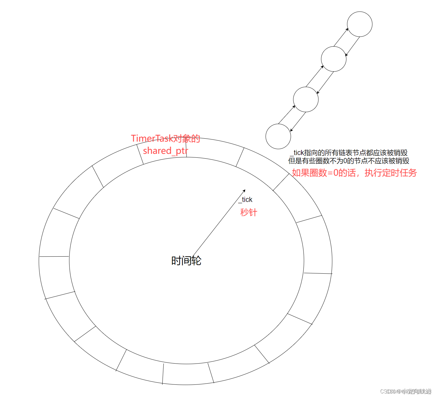 #include "TimerTask.hpp" TimerTask::TimerTask(uint64_t id, uint32_t timeout, const TaskFunc &cb, int turns) : _id(id), _timeout(timeout), _canceled(false),_task_cb(cb), _turns(turns) { }// 默认不取消定时任务 TimerTask::~TimerTask() { if (_canceled == false) _task_cb(); // 对象析构时执行定时任务 _release(); // 释放TimerWheel中所管理的TimerTask资源 } void TimerTask::Cancel() { _canceled = true; } void TimerTask::SetRelease(const ReleaseFunc &cb) { _release = cb; } uint32_t TimerTask::DelayTime() { return _timeout; } //每当秒针移动到下一个刻度时,检查该刻度上的所有任务。如果任务的圈数 _turns 大于0,则递减 _turns。当 _turns 变为0时,任务才有资格被执行。 void TimerTask::ReduceTurns() { --_turns; } int TimerTask::GetTurns() const{ return _turns; } //为了处理延时大于60秒的定时任务,每个任务有一个 _turns 成员变量。这个变量记录了任务需要经过的完整时间轮圈数。 void TimerTask::SetTurns(int turns) { _turns = turns; } TimerWheel.hpp