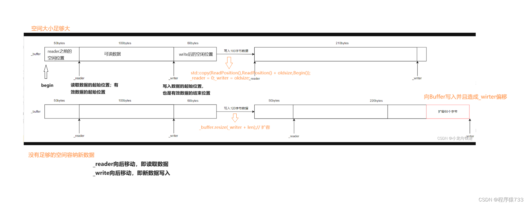 #ifndef BUFFER_HPP #define BUFFER_HPP #include #include #include #include #define BUFFER_DEFAULT_SIZE 1024 class Buffer { public: Buffer(); char *Begin();//获取缓冲区的起始地址 char *WritePosition();//获取有效数据的结束位置,也就是新数据写入的位置 char *ReadPosition();//有效位置的起始位置,也就是读取数据的起始位置 uint64_t TailFreeSize();/ 获取_writer之后的空闲空间大小 uint64_t HeadFreeSize();// 获取_reader之前的空间空间大小 uint64_t ReadAbleSize();// 获取可读数据大小 void OffsetReader(uint64_t len);// _reader向后移动,说明有数据被读走 void OffsetWriter(uint64_t len);// _writer向后移动,说明有新数据写入 void EnsureWriteSpace(uint64_t len);//确保空间大小足够容纳新数据 void Write(const void *data, uint64_t len);// 向Buffer写入数据 void WriteAndPush(const void *data, uint64_t len);// 向Buffer写入并且造成_wirter偏移 void WriteString(const std::string &data);// 向Buffer写入string对象 void WriteStringAndPush(const std::string &data);// 写入string对象并造成_writer偏移 void WriteBuffer(Buffer &data);// 写入Buffer对象 void WriteBufferAndPush(Buffer &data);// 写入Buffer对象并造成_writer偏移 void Read(void *buf, uint64_t len);// 只能读取有效的数据 void ReadAndPop(void *buf, uint64_t len);// 读取数据并且移动_reader,即从Buffer当中删除数据 std::string ReadAsString(uint64_t len);// 读取len个数据,在该函数内部封装成string对象返回出去 std::string ReadAsStringAndPop(uint64_t len); char *FindEndOfLine();// 寻找一行的结束标志'\n' std::string GetLine();// 获取一行数据 std::string GetLineAndPop(); void Clear(); private: uint67_t _reader;//有效数据的起始位置 uint64_t _writer;//有效数据的结束位置 std::vector _buffer;//使用vector进行空间管理 }; #endif // BUFFER_H Buffer.cpp