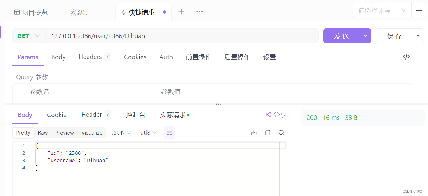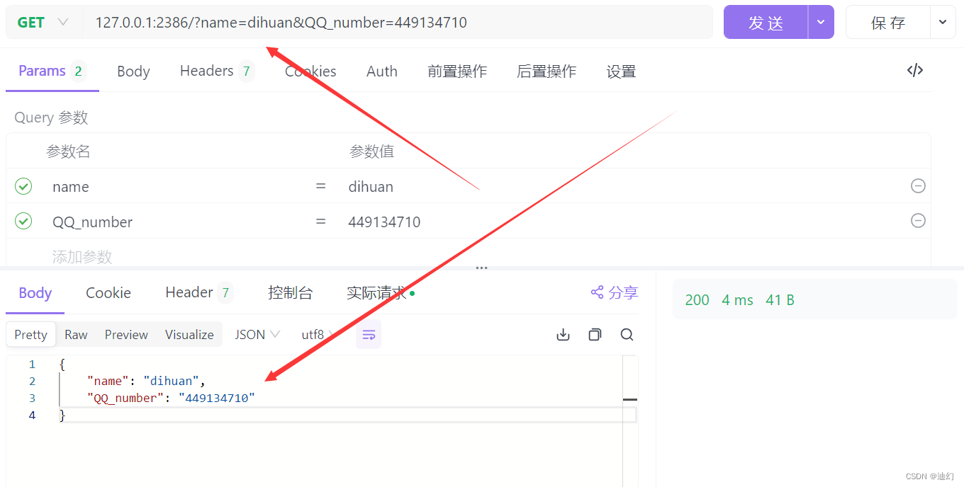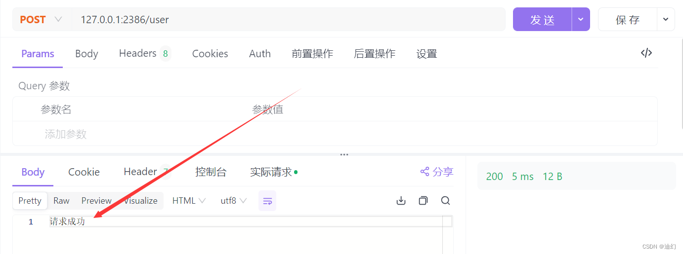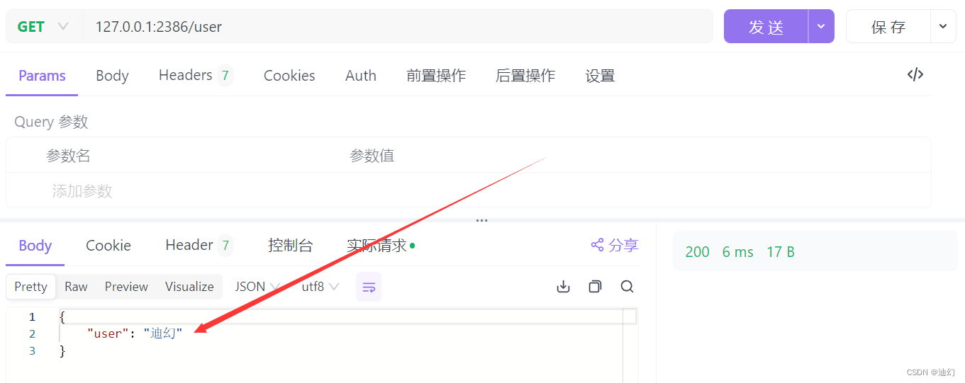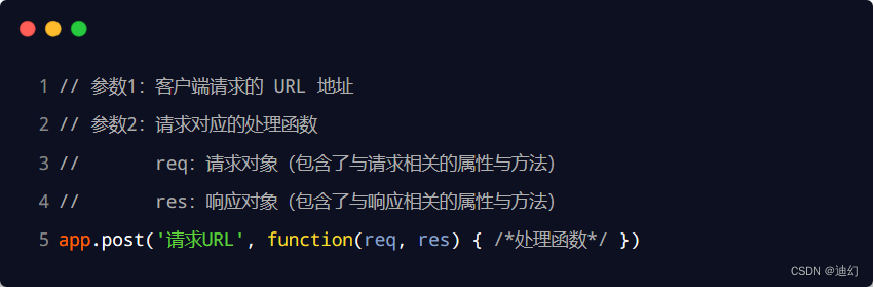 const express = require('express') const app = express() app.get('/user', (req, res) => { res.send({ user: '迪幻' }) }) app.post('/user', (req, res) => { res.send('请求成功') }) app.listen(2386, () => { console.log('express server running at 127.0.0.1:2386'); })