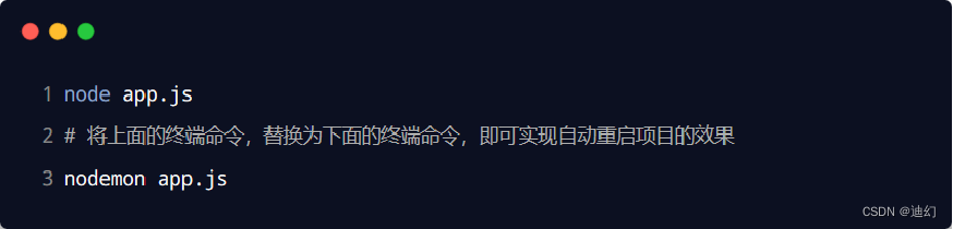 当基于 Node.js 编写了一个网站应用的时候,传统的方式,是运行 node app.js 命令,来启动项目。这样做的坏处是:代码被修改之后,需要手动重启项目。 现在,我们可以将 node 命令替换为 nodemon 命令,使用 nodemon app.js 来启动项目。这样做的好处是:代码被修改之后,会被 nodemon 监听到,从而实现自动重启项目的效果。