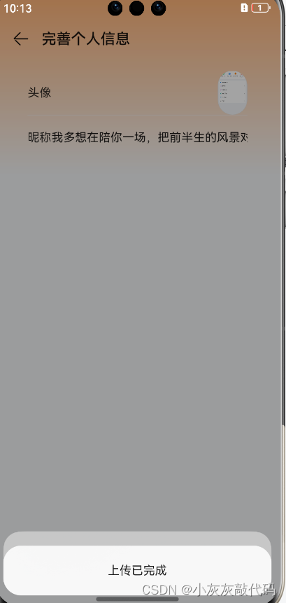 //1.用户选择图片后返回一个内存地址 async pickerAvatar() { //1.引导用户选择一张系统相册照片 //1.1绑定用户只能从系统相册选择一张图片 const options = new picker.PhotoSelectOptions options.MIMEType = picker.PhotoViewMIMETypes.IMAGE_TYPE //只能选择相片资源 options.maxSelectNumber = 1 //最大选择图片数目 //1.2 利用PhotoViewPicker对象实例中的select自动获取到用户选择的那张图片的地址 const pickerView = new picker.PhotoViewPicker() let urls = await pickerView.select(options) if (urls.photoUris.length <= 0) { return } let imgUrl = urls.photoUris[0] return imgUrl AlertDialog.show({ message: imgUrl }) } //2.利用已获得的内存地址将系统相册的图片拷贝到缓存目录 async copyImgToCache(photoImgPath: string) { // // 2.1 根据源地址获取文件的磁盘目录,通过openSync()来获得的内存地址 const file = fs.openSync(photoImgPath, fs.OpenMode.READ_ONLY) let fileFD = file.fd //2.2利用fs拷贝到目标地址 //获取目标地址文件夹目录 let destPath = getContext().cacheDir //随机生成一个文件名 let fileName = Date.now().toString() //固定一个文件扩展名 const ext = 'jpg' //组合成一个完整的目标文件路径 let fullPath = destPath + '/' + fileName + '.' + ext AlertDialog.show({ message: '完整路径' + fullPath }) fs.copyFileSync(fileFD, fullPath) //internal://cache代表fullPath 的文件路径 return [`internal://cache/${fileName + '.' + ext}`, fileName + '.' + ext] } //3.将获取到的图片上传到服务器 async uploadAvatar(arr: string[]) { let user = AppStorage.get('user') as ILoginUsersModel let token = user?.token let uploader = await request.uploadFile(getContext(), { method: 'POST', url: 'https://teach.itheima.net/hm/userInfo/avatar', header: { 'Content-Type': 'multipart/form-data', 'Authorization': `Bearer ${token}` }, files: [{ filename: arr[1], type: 'jpg', name: 'file', uri: arr[0] }], data: [] }) uploader.on('progress', (uploadedSize, totleSize) => { Logger.info('上传大小' + uploadedSize, '总大小:' + totleSize) if (uploadedSize === totleSize) { AlertDialog.show({ message: '上传已完成' }) } }) }
