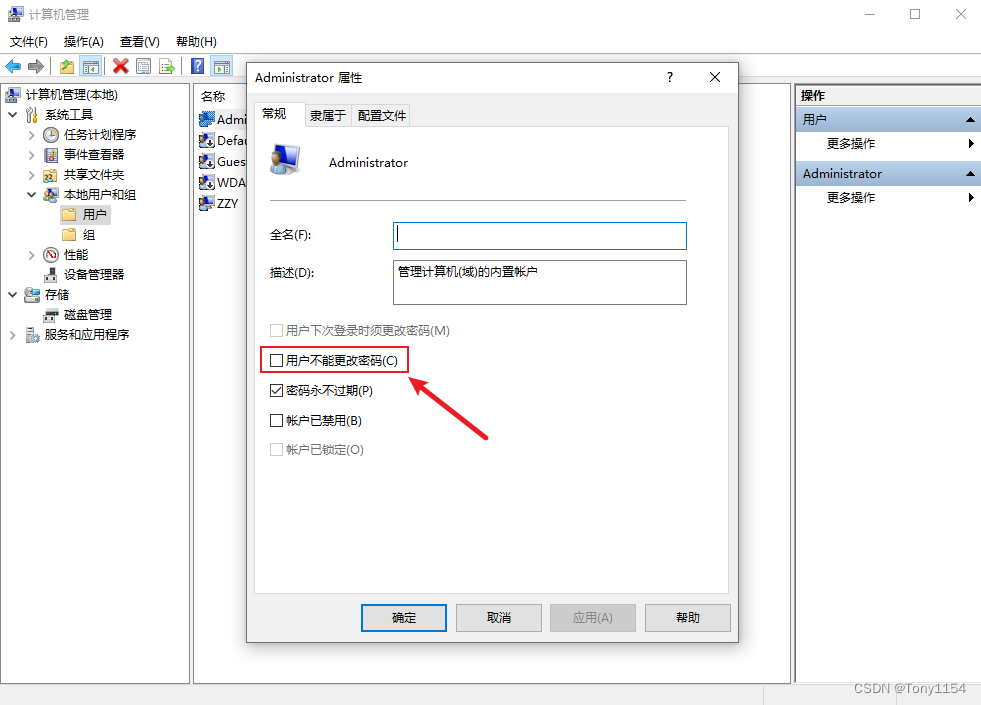 2.该计算机管理员administrator账户的“用户不能更改密码”这一选项没有被勾选