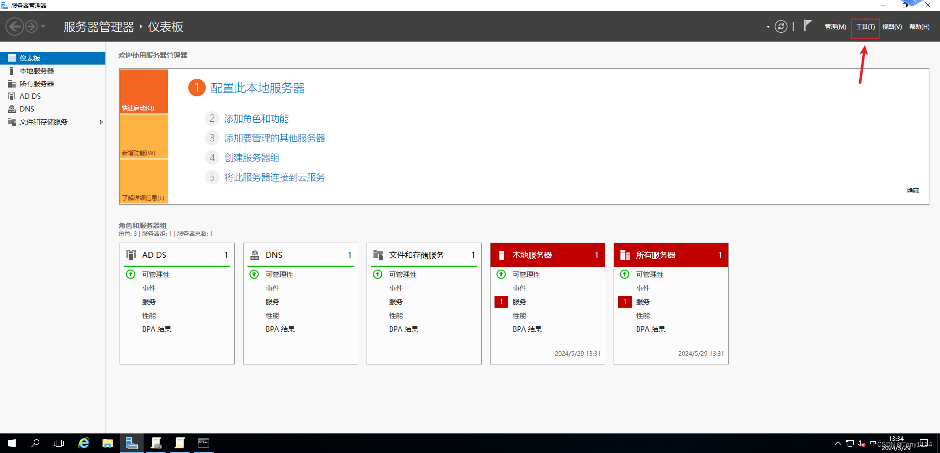 先打开域控服务器上面的服务器管理器,点击右上角的工具->组策略管理