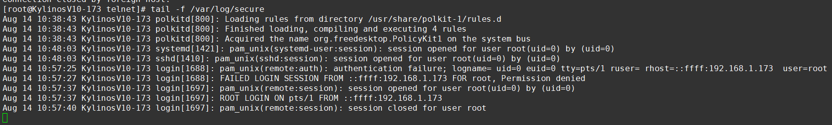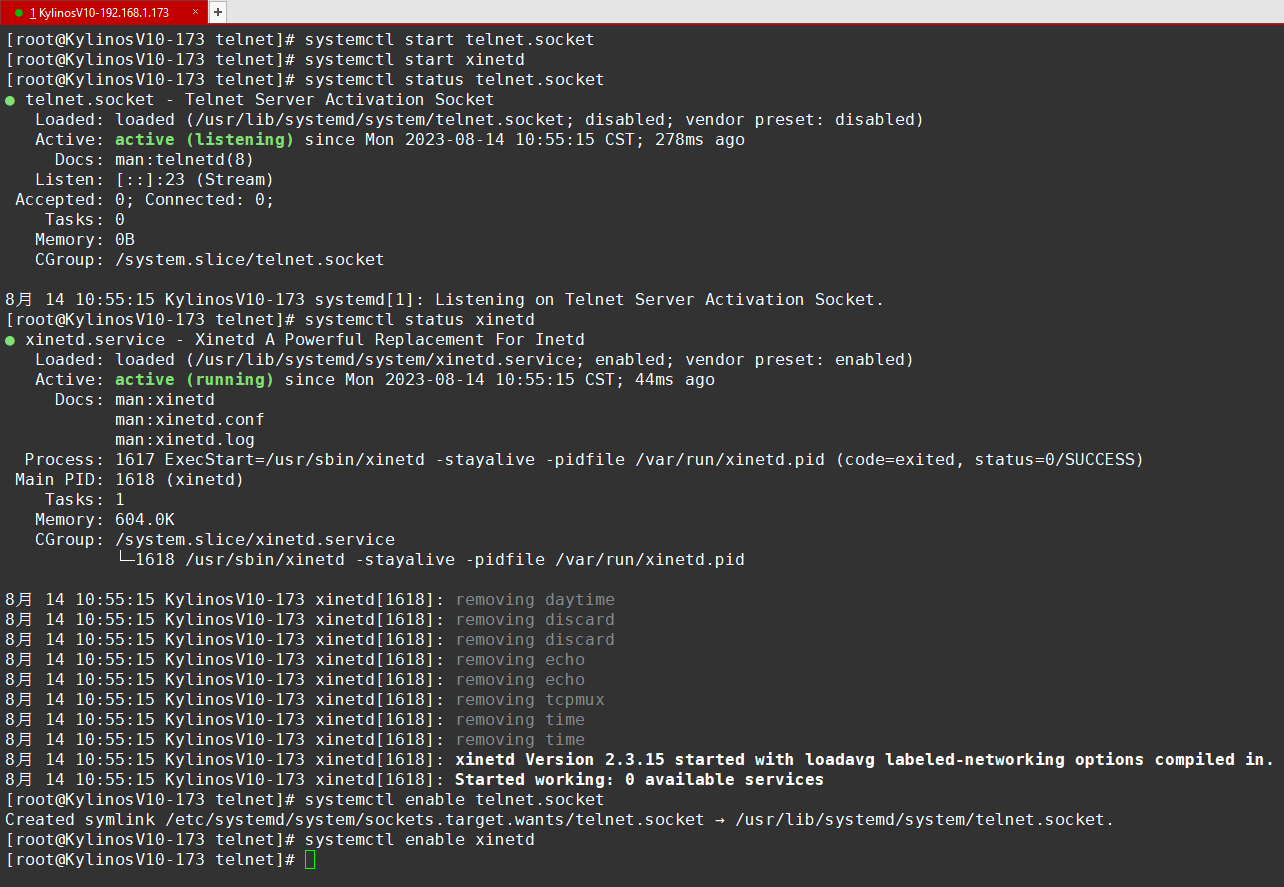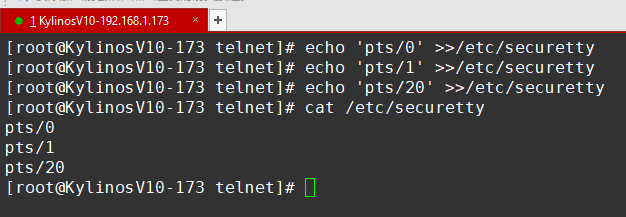 #这里可信终端可以多添加一些 echo 'pts/0' >>/etc/securetty echo 'pts/1' >>/etc/securetty echo 'pts/20' >>/etc/securetty #重启服务 systemctl restart telnet.socket systemctl restart xinetd systemctl status telnet.socket systemctl status xinetd