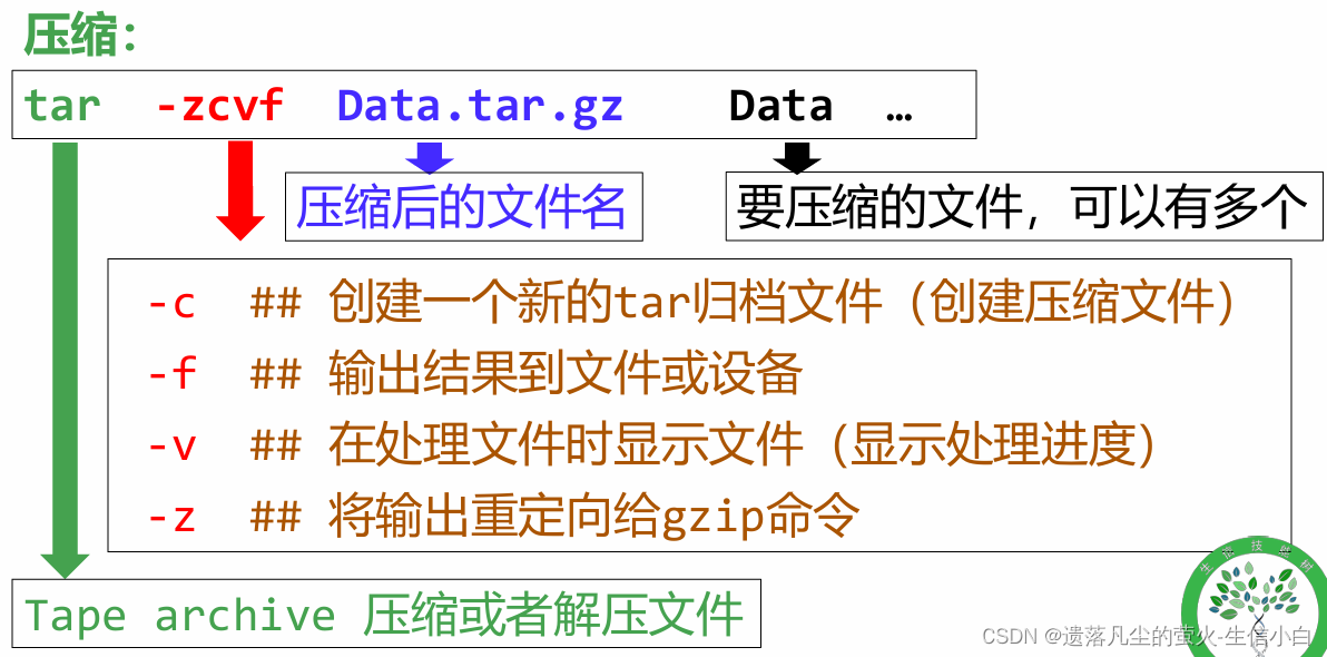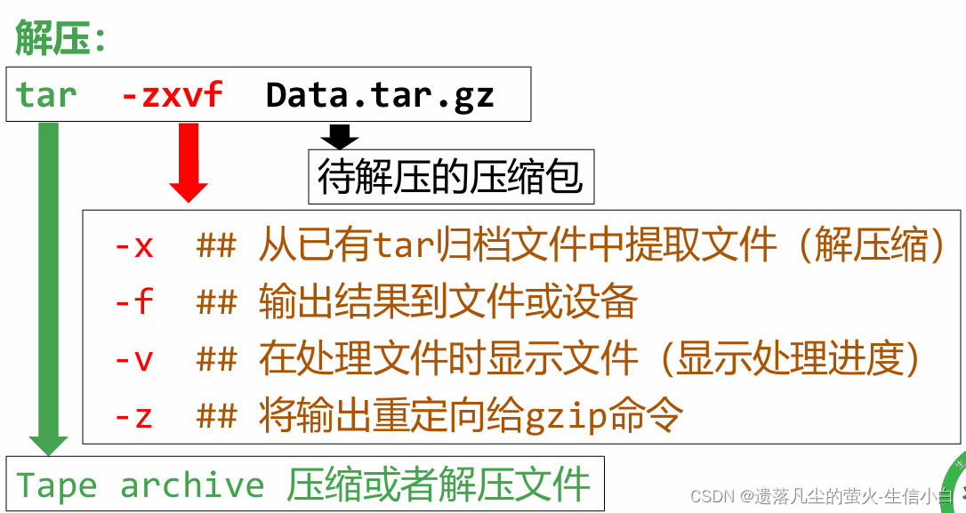 例如: tar-zxvf data.tar.gz分别对应命令+参数+文件