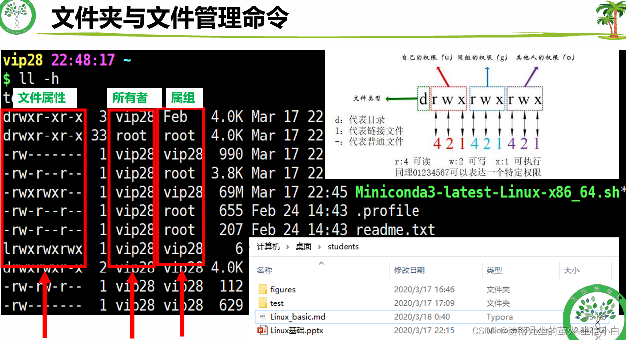 ls -l ## 列出当前目录下文件的详细信息,长列表格式显示文件和目录。在输出中,第一个字符表示文件类型,其中d表示目录,-表示普通文件