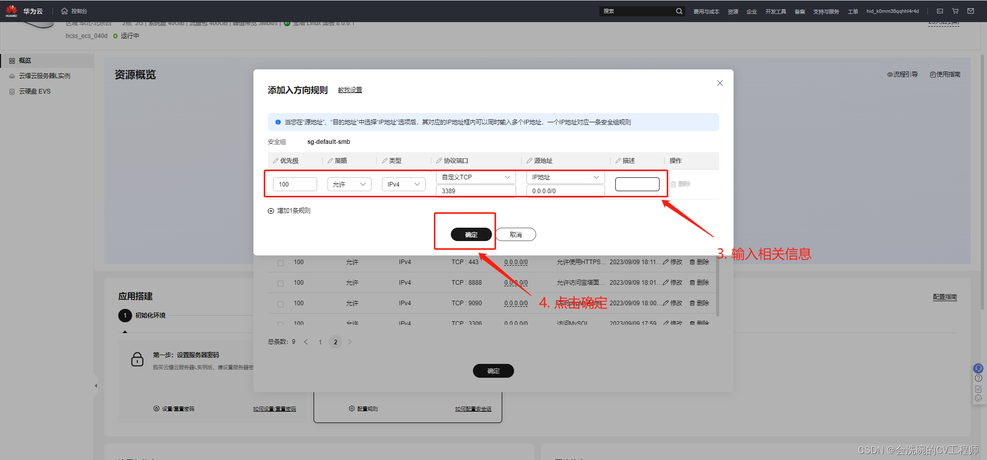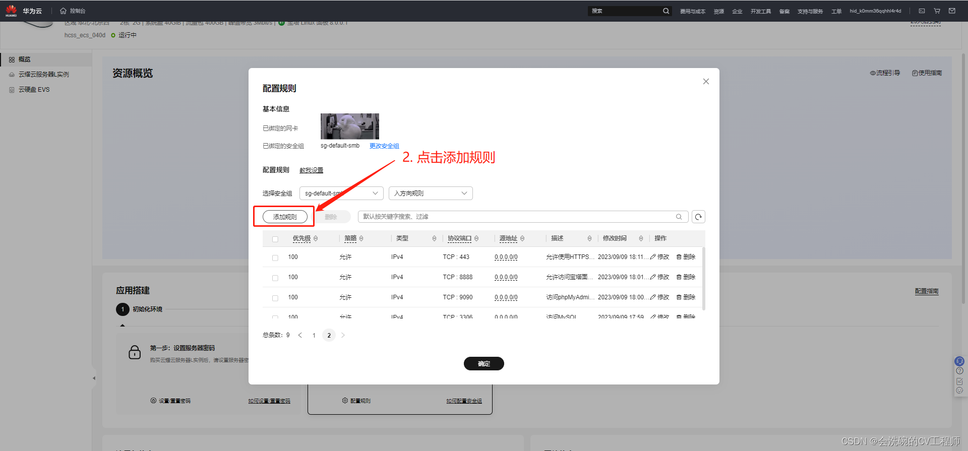 选择“安全组”页签,单击“添加规则”,添加如下规则配置。本例只添加基本规则,您可根据需要添加更多规则。