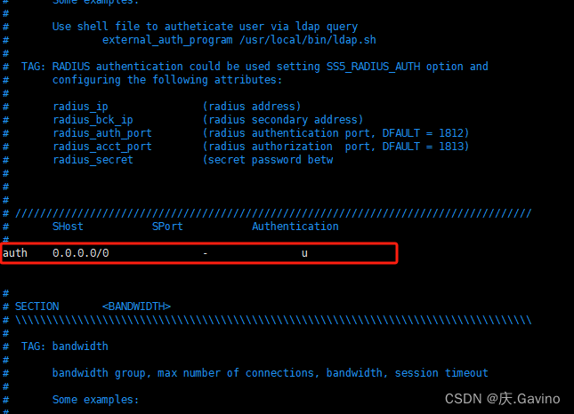 vim /etc/opt/ss5/ss5.conf 找到auth的配置,默认是注释了的,先放开注释(就是把首行的#去掉),然后把Authentication这列改为u,以下是修改后的截图