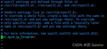 vim /etc/sysctl.conf 找到一行类似于net.ipv4.ip_forward=0的配置项。如果没有找到该配置项,可以在文件的末尾添加一行net.ipv4.ip_forward=1,如下