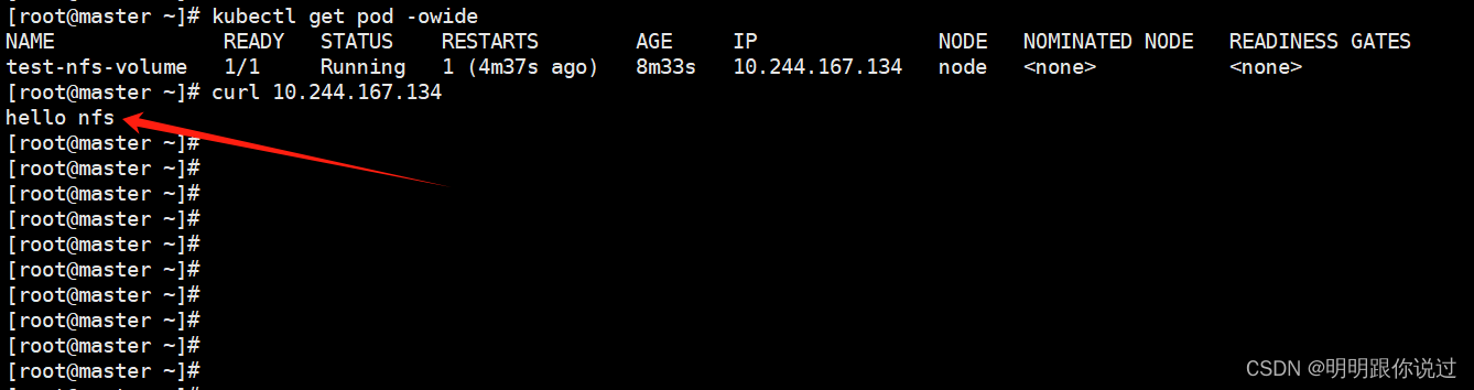 此处可以看到我们刚刚创建的文件的内容,证明k8s调用nfs作为持久化存储成功