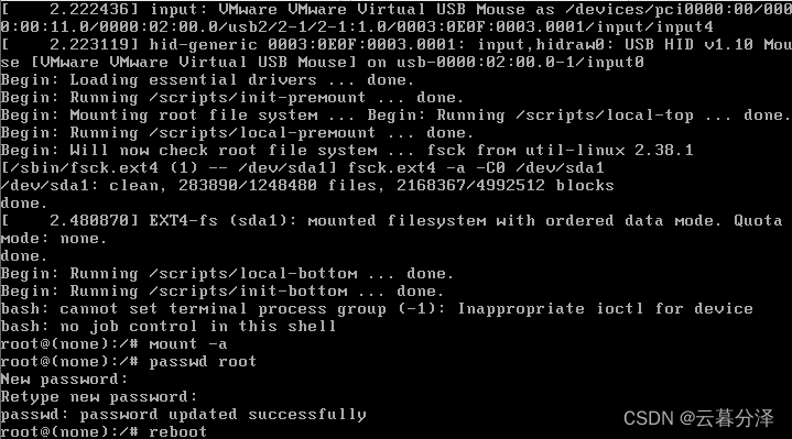 最后待进入系统后,执行命令mount -a 和passwd root 进行设置全新的root密码。设置完成后重启系统,即可破解root密码