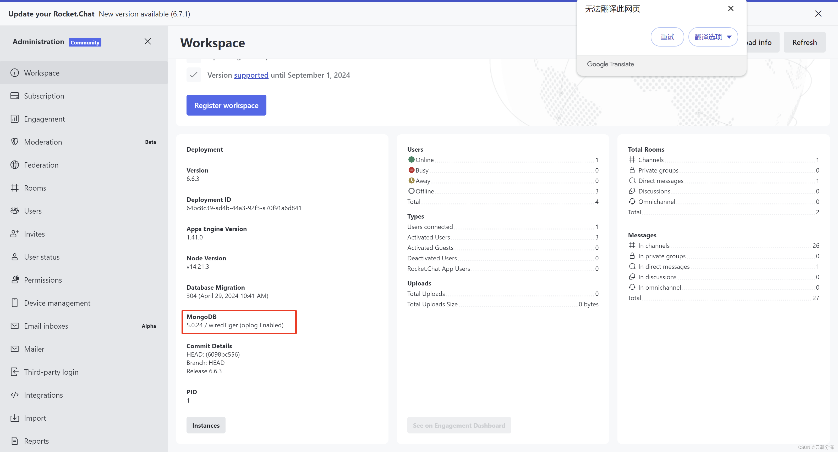 admin@admin.com34.rocketchat服务器中,聊天服务使用的数据库的版本号是?
