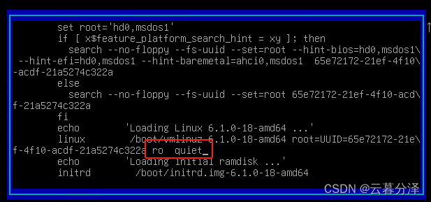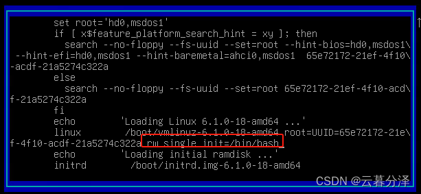 然后 编辑linux那行最后面的 ro single 改成 rw single init=/bin/bash,按ctrl+x执行重启