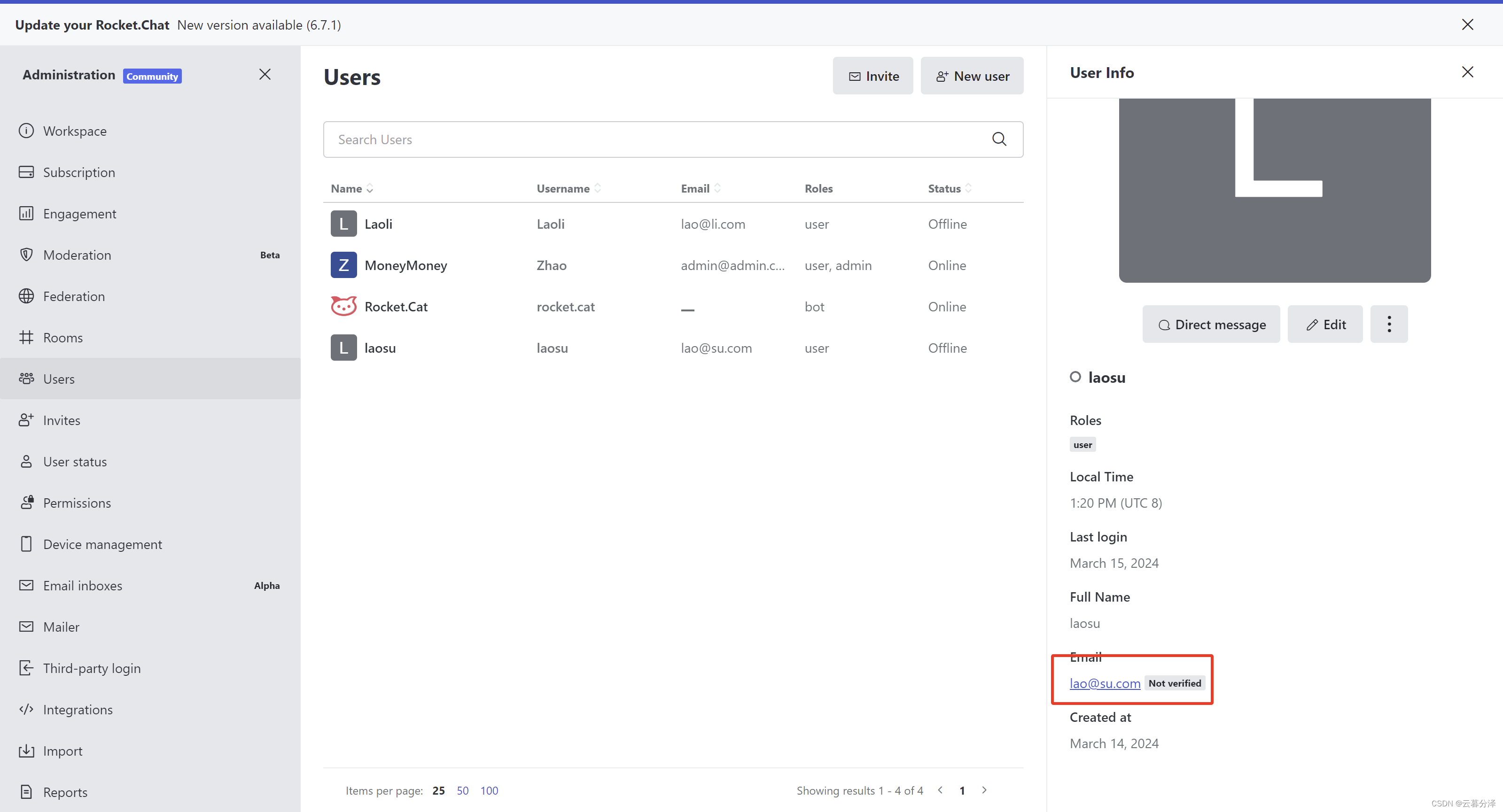 36.rocketchat服务器中,管理员账号的创建时间为?