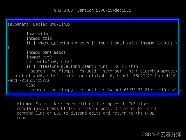 首先在启动系统的时候使用上下键头停留在选择启动方式界面,按‘e’进入编辑模式。
