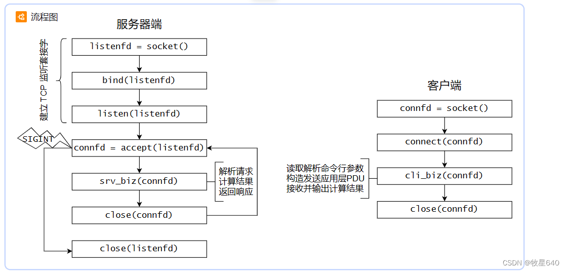//client.c #include #include #include #include #include #include #include #include void usage(const char *str) { printf("%s usage:\n", str); } int main(int argc, char *argv[]) { // 存放ip_str char ip_str[20] = {0}; if (argc != 3) { usage(argv[0]); return 1; } struct sockaddr_in serv_addr; int sockfd; // 返回客户端的进程描述符 sockfd = socket(AF_INET, SOCK_STREAM, 0); if (sockfd < 0) { perror("socket"); return 1; } serv_addr.sin_family = AF_INET; serv_addr.sin_port = htons(atoi(argv[2])); serv_addr.sin_addr.s_addr = inet_addr(argv[1]); // connect表示客户端与服务端尝试建立连接 // connect里面的输入参数有要连接服务端的地址 // connect执行的时候就会被服务端listen检测到 // 如果accept没有阻塞的话,这时候就会进行三次握手 // 三次握手完成以后,服务端执行完accept,客户端执行完connect // 发起客户端请求连接 int ret = connect(sockfd, (struct sockaddr *)&serv_addr, sizeof(serv_addr)); if (ret < 0) { perror("connect"); return 1; } else { // 转换IP地址 inet_ntop(AF_INET, &serv_addr.sin_addr, ip_str, sizeof(ip_str)); printf("[cli] server[%s:%d] is connected!\n", ip_str, ntohs(serv_addr.sin_port)); } char buf[140] = {0}; char *to_exit = "EXIT"; while (1) { memset(buf, 0, 140); fgets(buf, 140, stdin); int if_exit = strncmp(buf, to_exit, 4); if (if_exit == 0) break; // 写入并打印写入内容 write(sockfd, buf, strlen(buf)); printf("[ECH_RQT]%s", buf); memset(buf, 0, 140); read(sockfd, &buf, sizeof(buf) - 1); // 显示服务器发送的内容 printf("[ECH_REP]%s", buf); memset(buf, 0, 140); } close(ret); printf("[cli]listenfd is closed!\n"); printf("[cli]server is to return! \n!"); return 0; } 编译服务器(server.c)