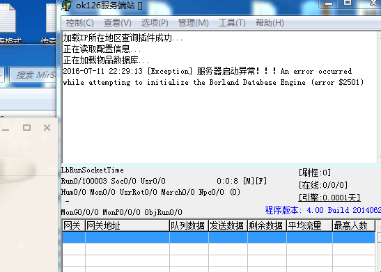 加载IP所在地区查询插件成功... 正在读取配置信息... 正在加载客户端版本信息... 加载客户端版本信息成功... 正在加载物品数据库... 服务器启动异常!!!An error occurred while attempting to initialize the Borland Database Engine (error $2501)