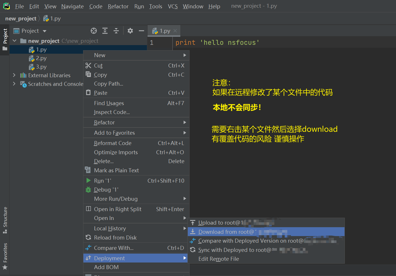 注意:但如果你在远程修改了代码,或者是在远程目录下新建/删除了文件,并不会同步到本地,需要手动down/up