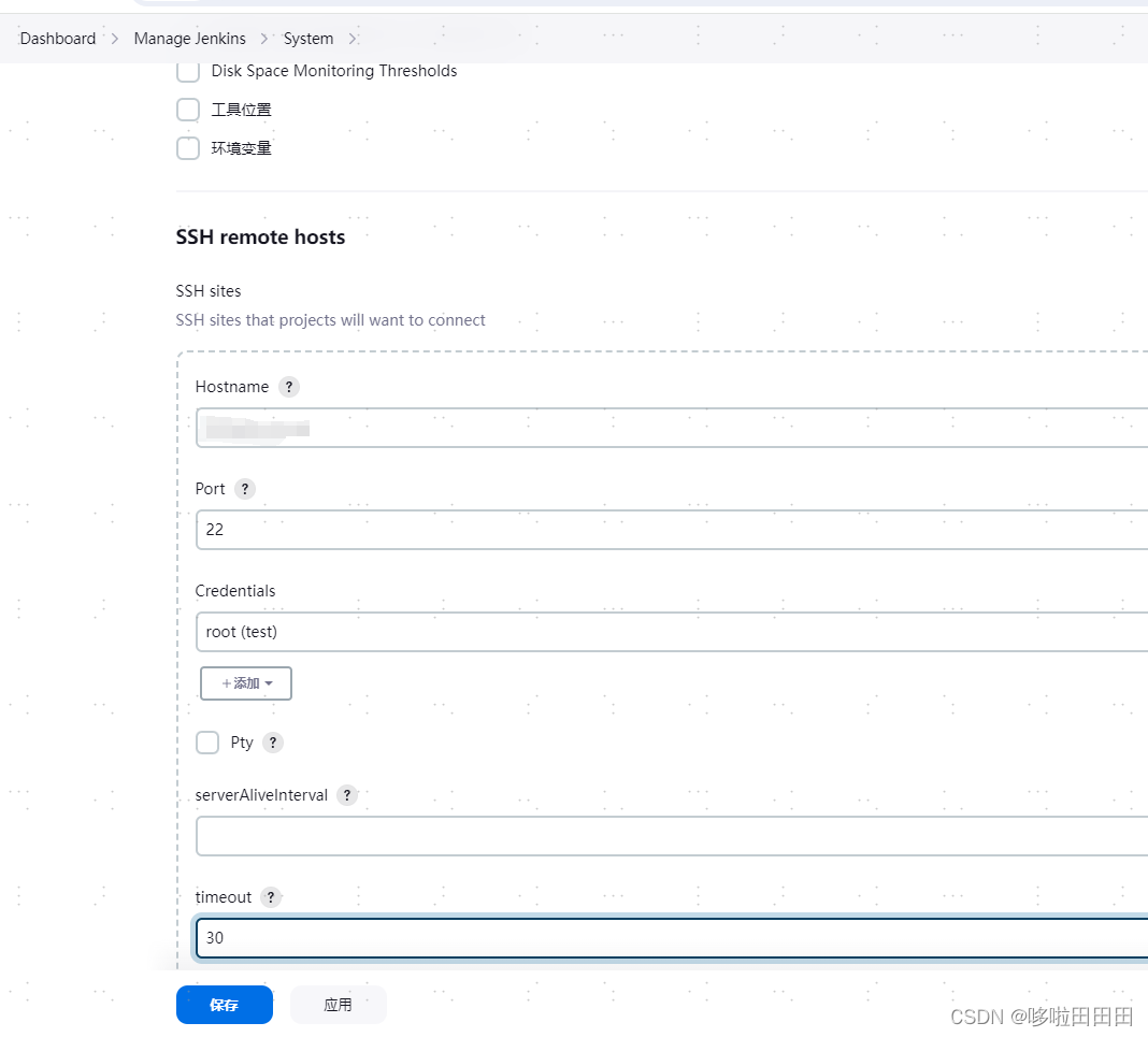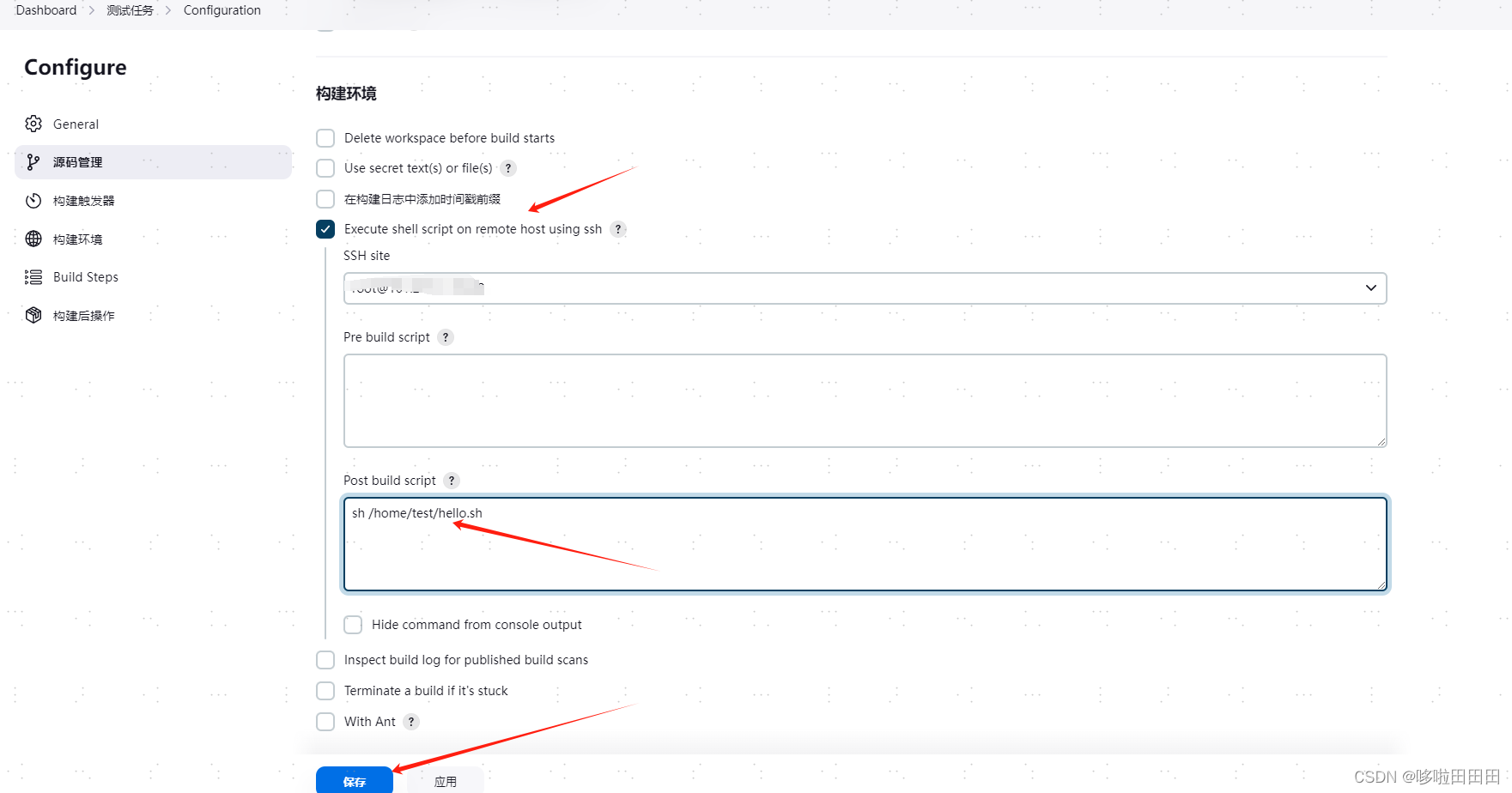 SSH remote hosts 配置SSH服务器站点,ip,账号,密码以及刚刚创建的凭证,保存