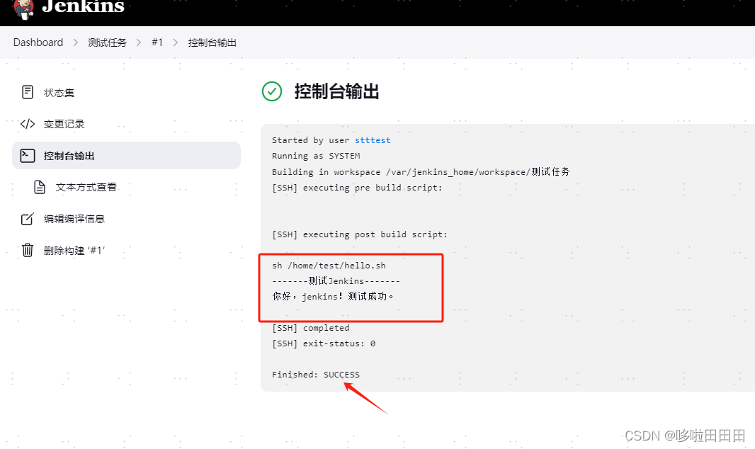 点击查看构建历史,点击控制台输出,就可以看到执行结果 SUCCESS