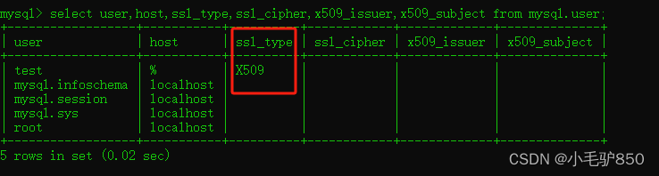 ALTER USER 'test'@'%' REQUIRE SSL(X509);