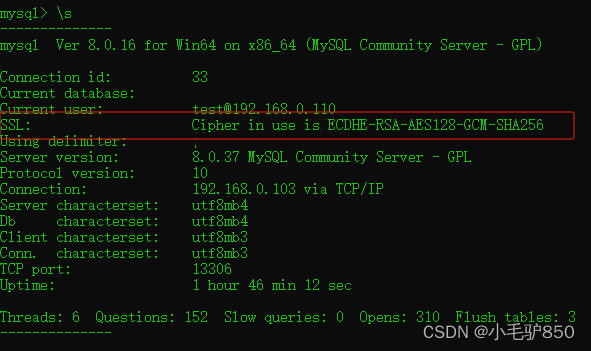 mysql --ssl-ca=E:\\installprograms\\zhuomian\\SSL\\ca.pem --ssl_cert=E:\\installprograms\\zhuomian\\SSL\\client-cert.pem --ssl-key=E:\\installprograms\\zhuomian\\SSL\\client-key.pem -utest -P13306 -h192.168.0.103 -p