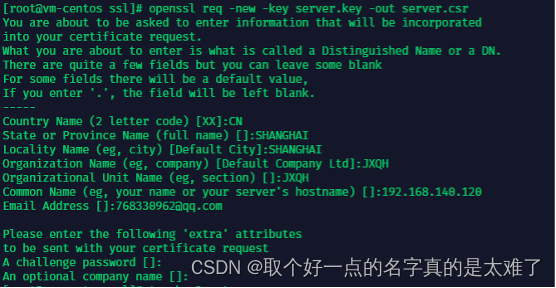 注:这里依次需要输入国家 CN、省份:SHANGHAI、城市:SHANGHAI、组织名称:XXX、组织代码:XXX、自签的证书IP或域名:192.168.140.120、邮箱:xxx@qq.com
