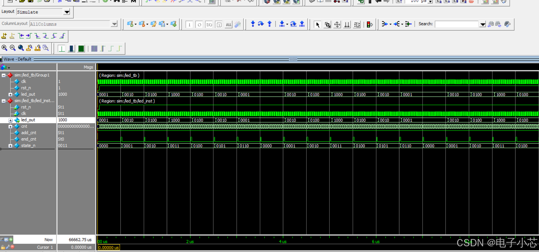 从波形图中我们可以看到LED灯首先会从0001——1000进行流水,然后又会从1000——0001进行反方向流水,与我们设计的要求一致,设计简单,所以就不进行下板验证了。